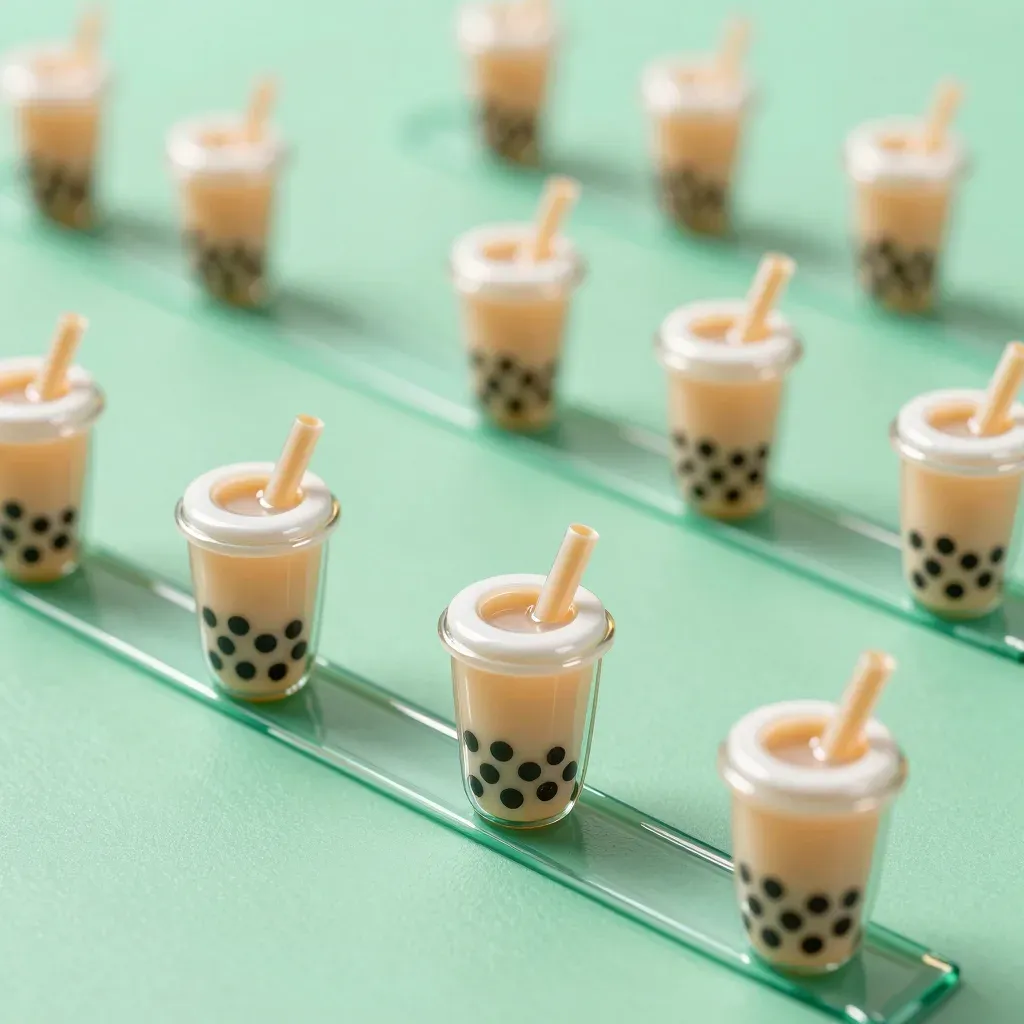 Rows of glossy bubble tea cups with black tapioca pearls, light brown liquid, and pale yellow straws, softly lit and arranged in a symmetrical, clean composition against a mint green background. The soft lighting and shallow depth of field create a visually appealing and clean backdrop for product photography.