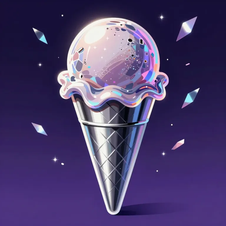 A crystal-clear ice cream cone with a glossy sphere of ice cream reflects the starry night sky, creating a mesmerizing interplay of light and color. The close-up view and shallow depth of field emphasize the texture and vibrant colors of the ice cream and cone against the blurred, star-filled background.