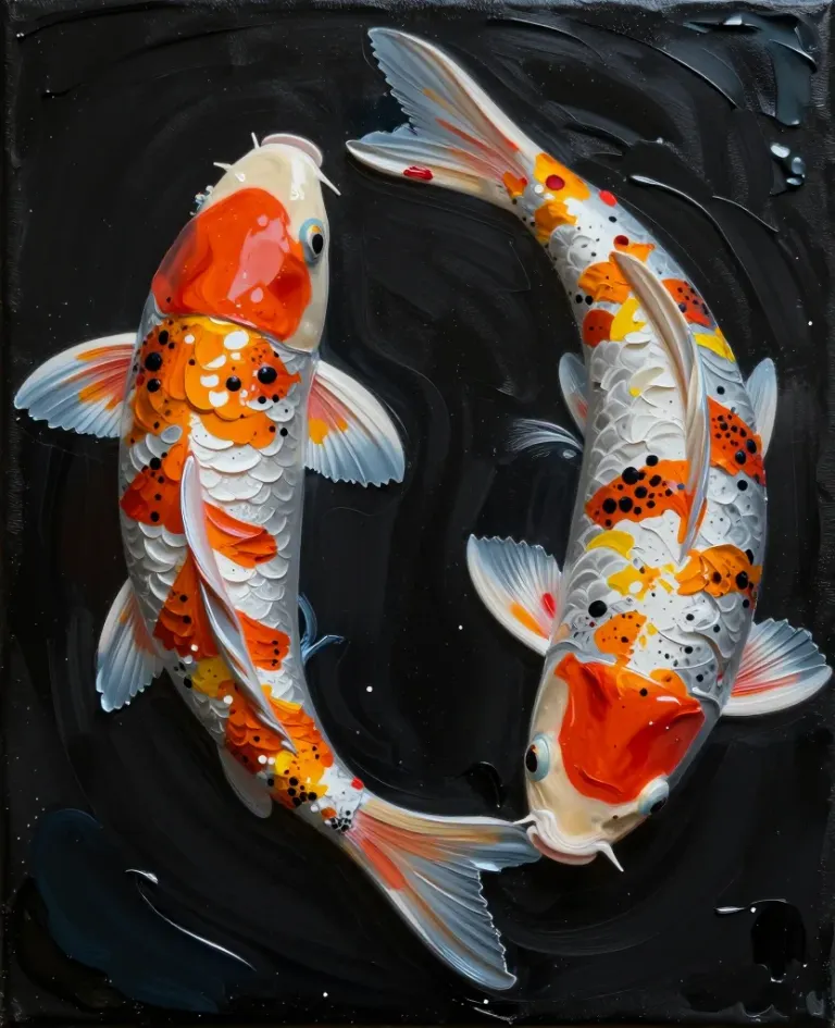Two koi fish with intricate, glossy scales curve gracefully against a dark, textured background. Soft directional lighting highlights the reflective scales and creates subtle shadows, enhancing the dynamic composition.
