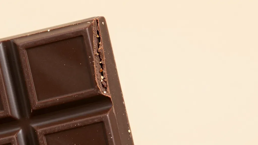 A close-up of a dark chocolate bar broken in half, revealing a glossy interior with visible specks, under warm ambient lighting that highlights the texture and color. The neutral, blurred background ensures the chocolate remains the focal point.
