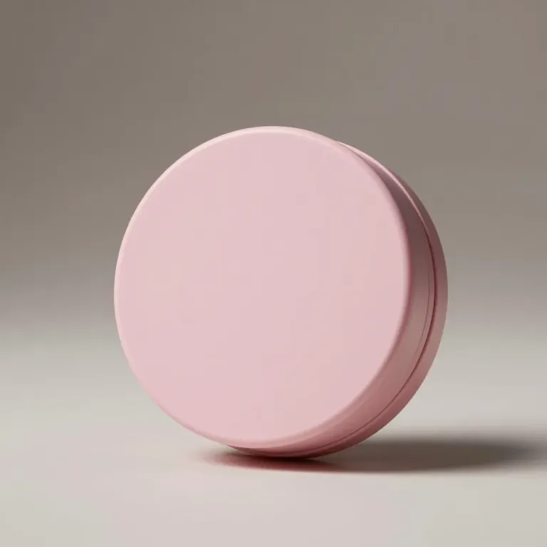 A smooth, glossy, pastel pink compact case slightly tilted, illuminated by soft, diffused lighting. The minimalist composition and shallow depth of field create a clean, focused presentation ideal for product photography.