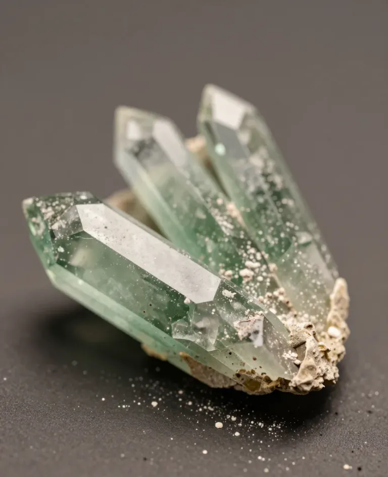 A close-up of translucent green crystals with a dusty beige matrix, illuminated by soft, diffused light that highlights their texture and creates subtle shadows. The dark, neutral background enhances the specimen's details and provides a clean, focused composition.