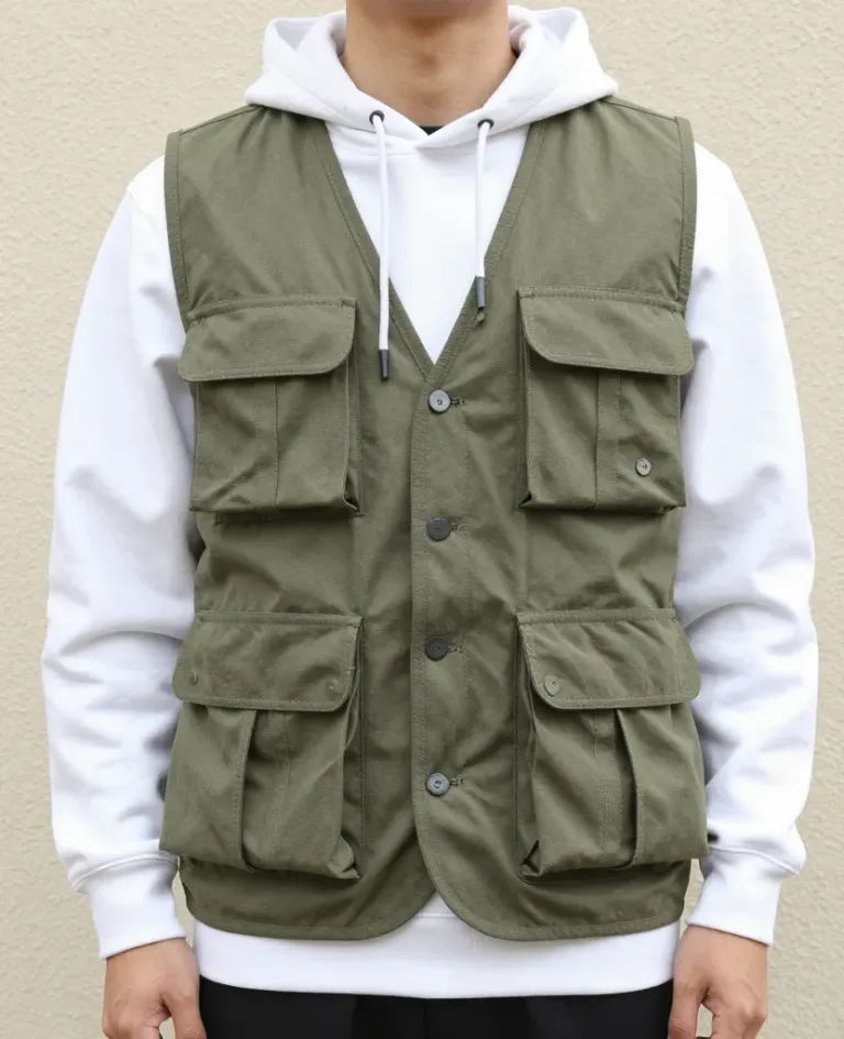 A model wears an olive utility vest over a white hoodie, with soft, diffused lighting highlighting the texture of the vest. The neutral, textured background slightly blurs to emphasize the subject.