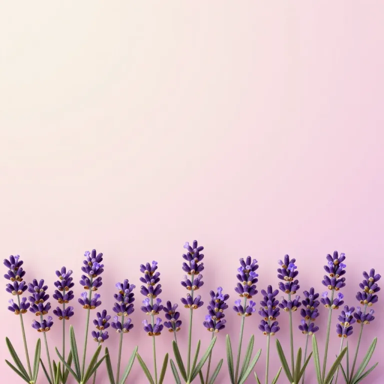 A horizontal border of lavender sprigs with small purple flowers, set against a soft pink background. Diffused, gentle lighting highlights the delicate petals and stems, creating a serene and elegant composition.