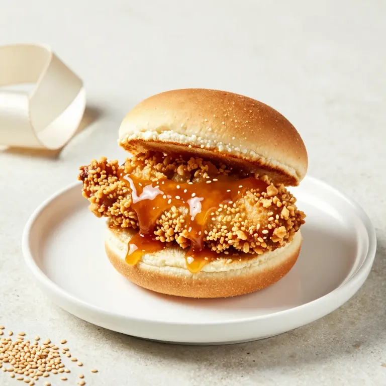 A crispy fried chicken sandwich with a golden-brown textured coating and amber-orange glossy sauce oozing from a sesame seed bun, presented on a white plate. Soft overhead lighting highlights the sauce's sheen and the bun's texture, with shallow depth of field and a clean, neutral background providing ample copy space.