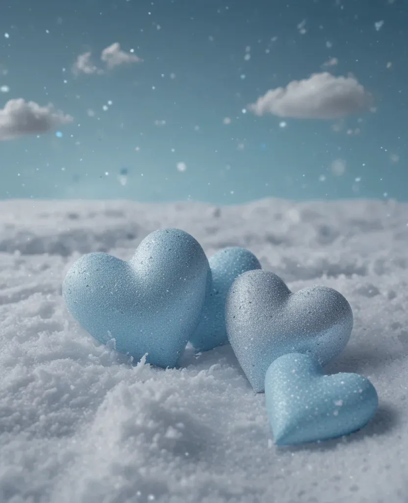 Five glossy, translucent blue hearts cluster together on a snowy landscape, illuminated by soft, diffused light that creates gentle highlights and shadows. The shallow depth of field and slightly blurred background emphasize the hearts and add a dreamy, ethereal quality to the scene.