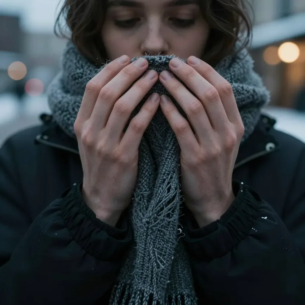 A person holds a thick, knitted scarf close to their face, creating a cozy, intimate scene against a softly lit, blurred urban backdrop. The diffused light and shallow depth of field emphasize the texture of the scarf and the subject's hands, creating a warm, inviting atmosphere.