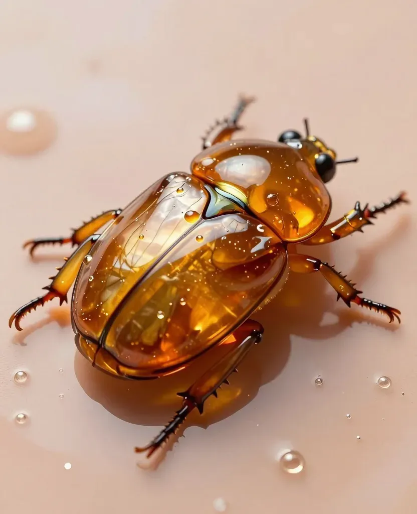 A translucent amber beetle with golden hues and clear water droplets glistens under soft, diffused light, highlighting its glossy texture and intricate details. The shallow depth of field and diagonal composition emphasize the beetle's vibrant colors and create a visually striking image.