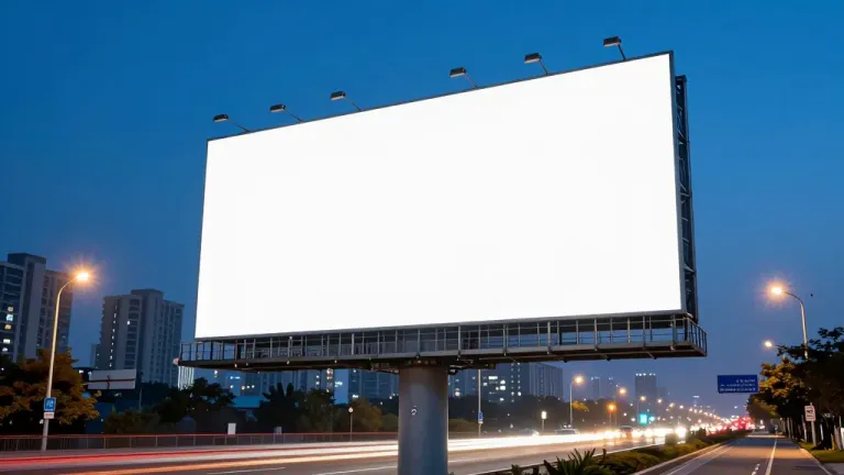 A towering blank billboard stands illuminated by warm, golden streetlights against a deep blue sky, with streaks of light from moving vehicles adding dynamic motion. The urban landscape, featuring buildings, trees, and traffic, provides a clean and structured backdrop, ideal for showcasing branding or advertisements.