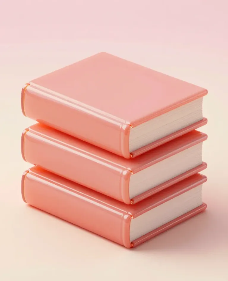 A stack of four glossy, peach-colored books with white pages, softly lit from above, creating gentle highlights and subtle shadows, set against a soft pink gradient background that enhances the subject's prominence.