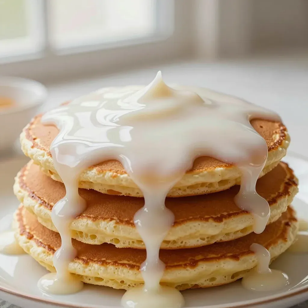 A close-up of fluffy golden pancakes stacked high, drizzled with glossy coconut cream glaze, illuminated by warm, soft light from above. The shallow depth of field draws attention to the glossy texture and golden hue, while the blurred background suggests a cozy kitchen setting.