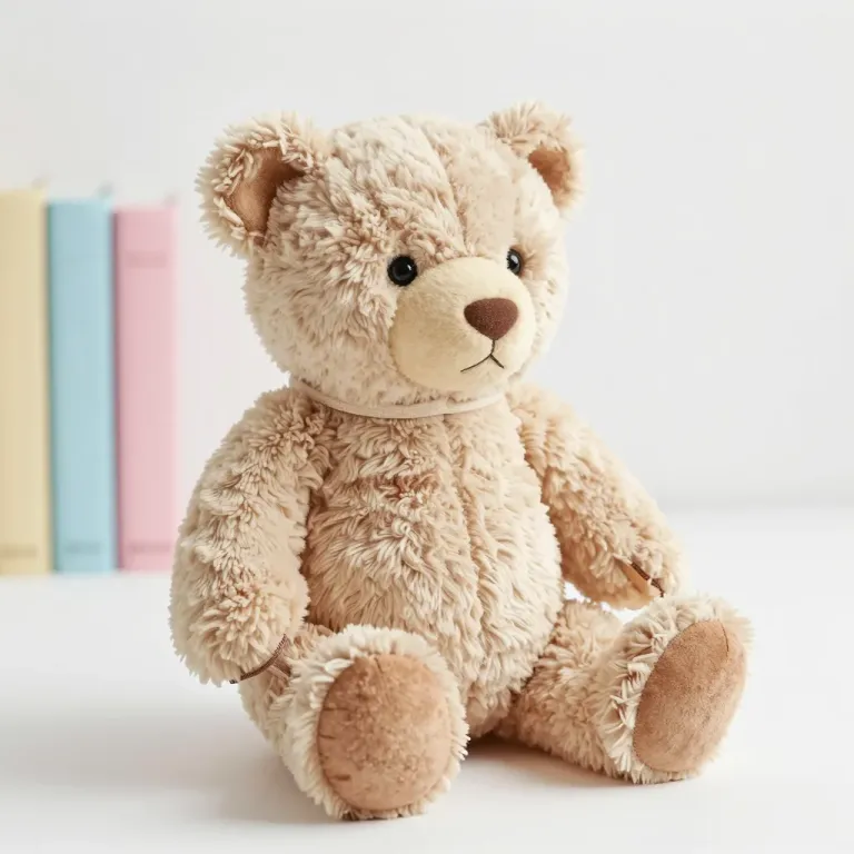 A beige teddy bear sits upright with soft, fluffy fur, slightly spread arms and legs, illuminated by soft, diffused light from above, creating gentle shadows. The background features a row of pastel-colored books, slightly out of focus, adding depth and context to the image.