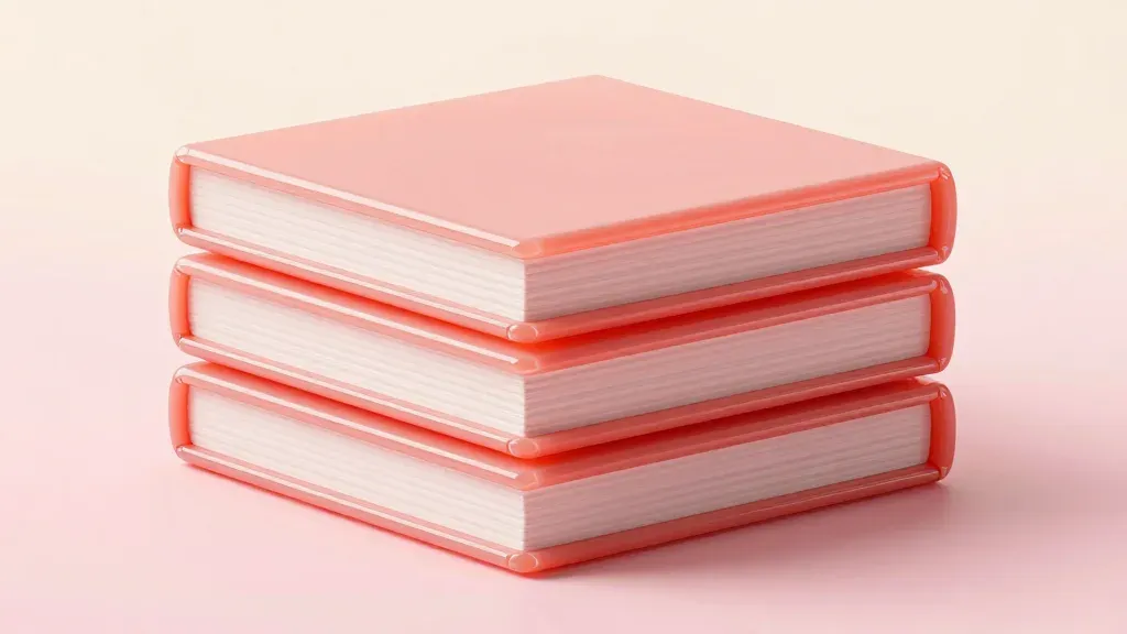 A stack of glossy coral-pink books with a soft, diffused light casting gentle shadows, creating a minimalist and elegant composition. The shallow depth of field and pastel pink background emphasize the books' smooth texture and vibrant color, making it ideal for design elements or educational content.