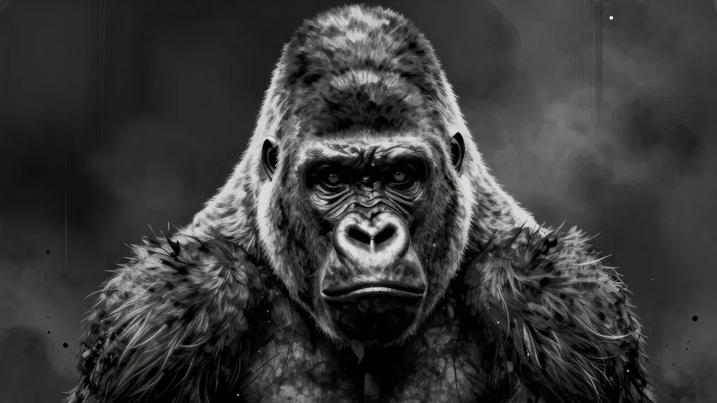 A close-up of a gorilla's face, showcasing detailed fur texture and glossy sheen under intense, directional lighting. The dark, blurred background enhances the subject's dramatic presence and depth of field.