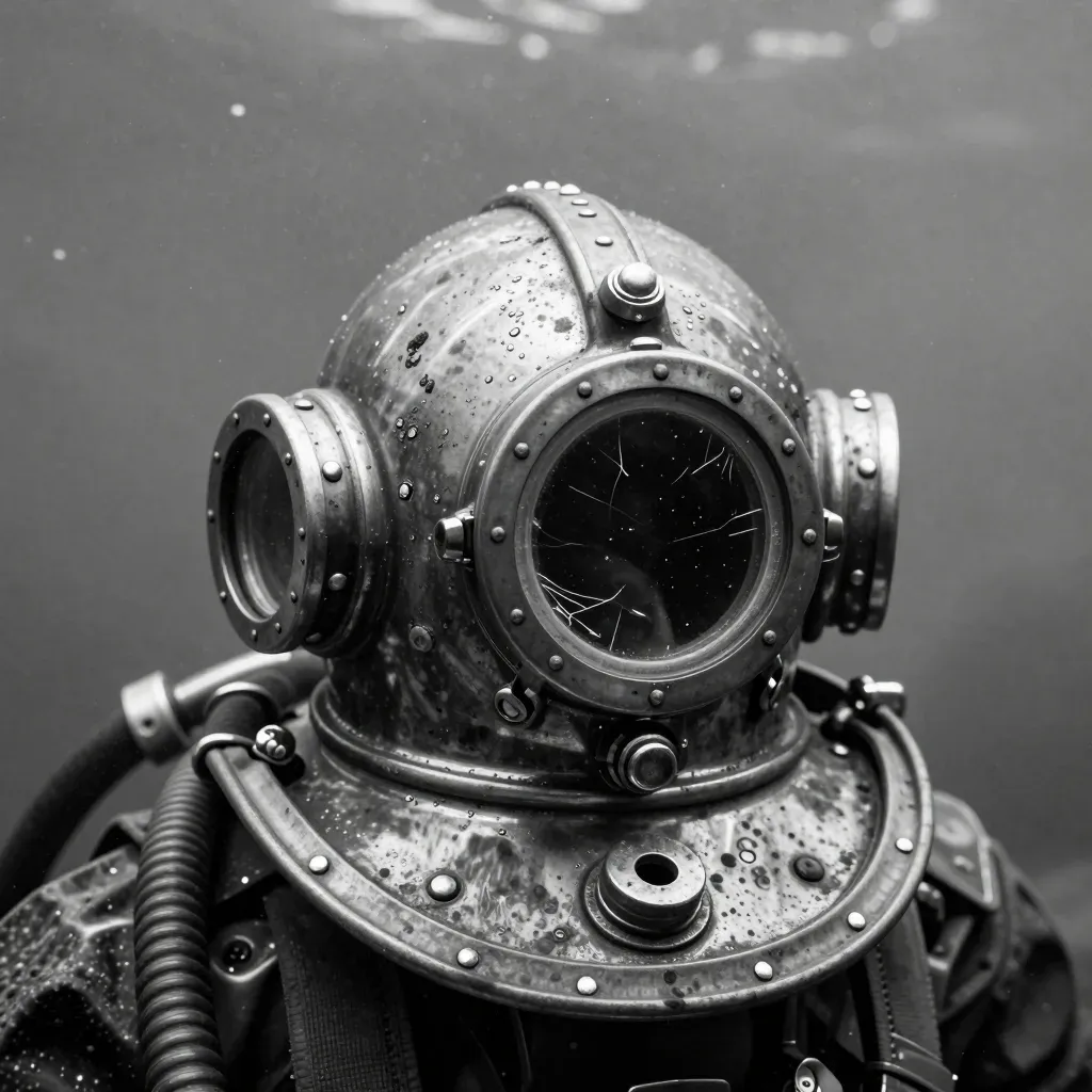 A close-up of a deep-sea diver's helmet, showcasing its glossy metal texture and condensation, with soft fogged glass revealing the diver's face. Directional lighting highlights the helmet's contours and water droplets, creating a reflective and textured effect against a blurred ocean background.