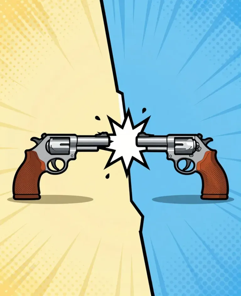 Two polished wooden-handled revolvers face each other in a split background of warm yellow and cool blue, with bright, direct lighting creating sharp shadows and highlights. The symmetrical composition and contrasting colors add depth and focus to the dramatic confrontation.