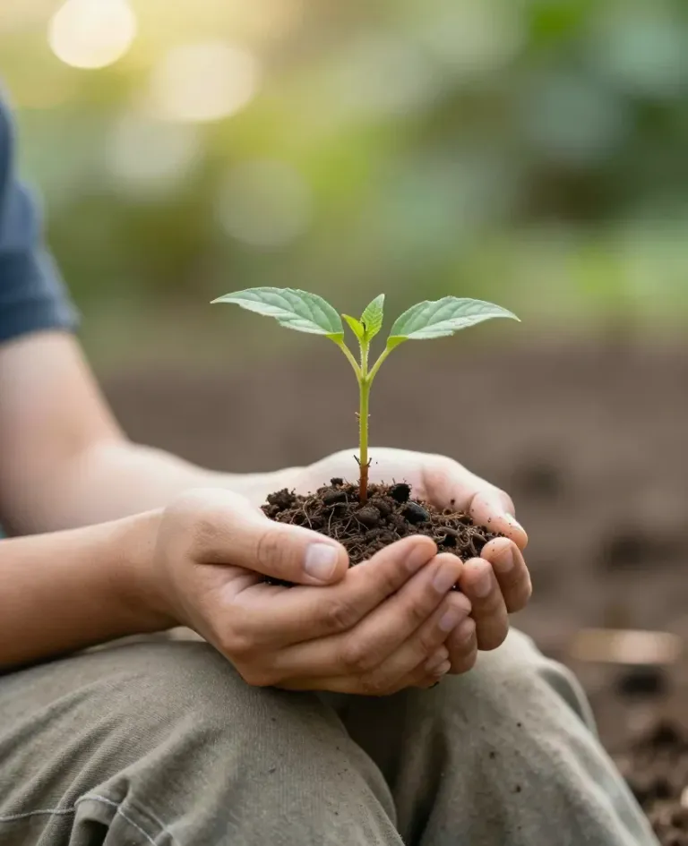 A pair of hands gently cradle a small seedling with moist, crumbly soil, bathed in soft, diffused morning light. The blurred background of a garden or park setting enhances the serene, natural atmosphere.