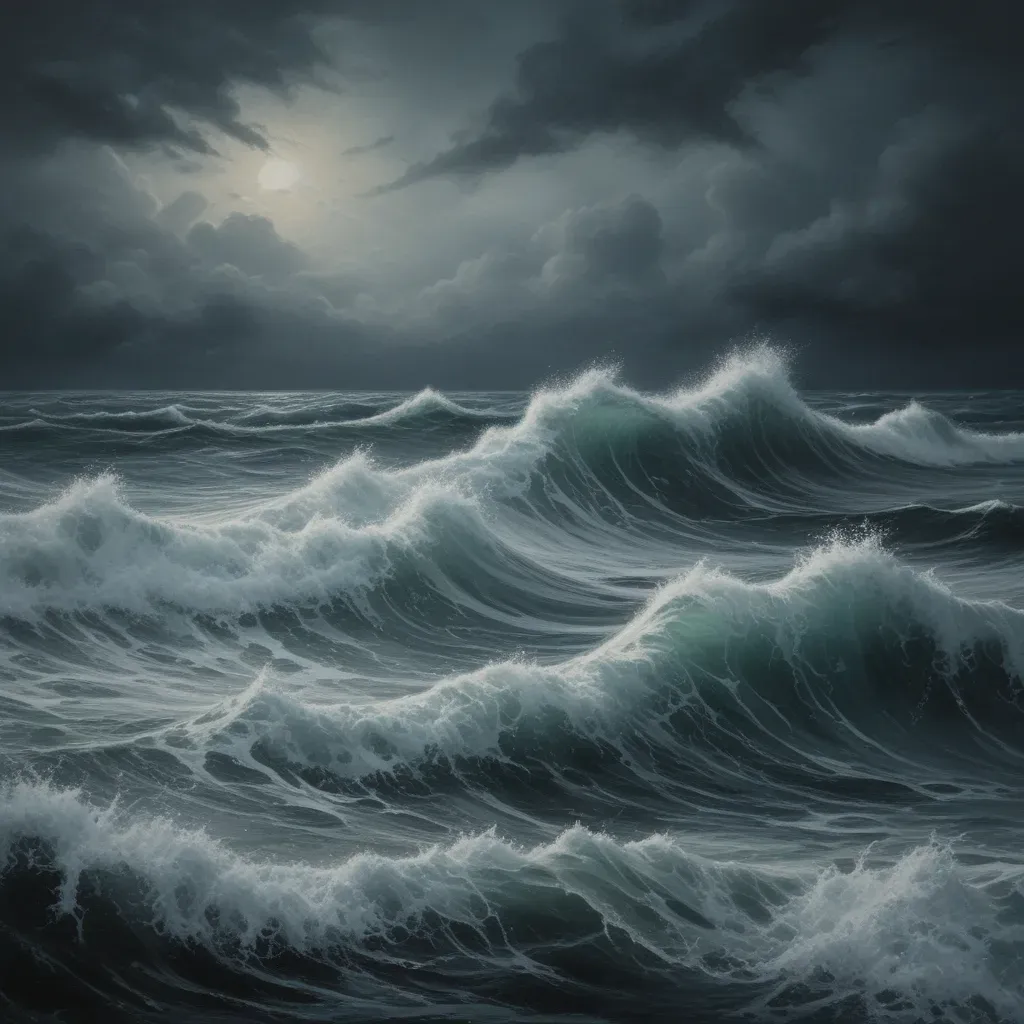 Glossy, frothy waves dominate the foreground, leading the eye towards the moonlit sky filled with dark, swirling clouds. The soft, diffused light of the moon creates a high contrast between illuminated areas and deep shadows, enhancing the dramatic atmosphere.