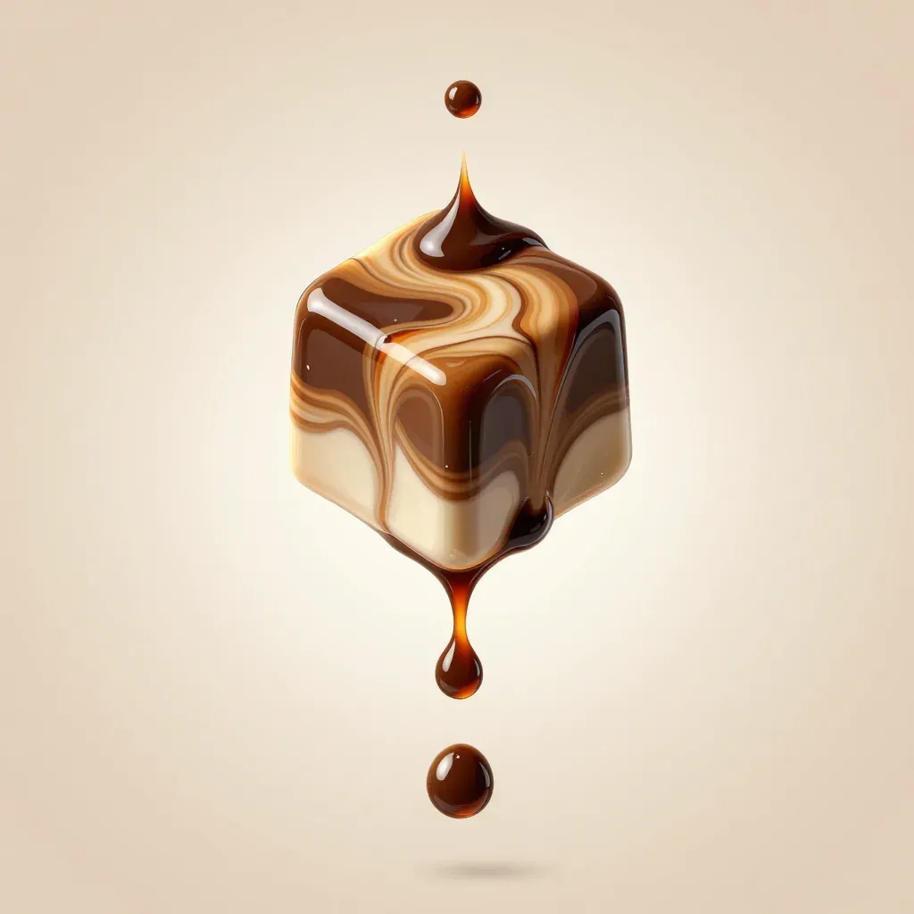 A glossy, three-dimensional cube of coffee and cream cascades with droplets, illuminated by soft, diffused lighting that highlights its glossy texture and creates subtle shadows, set against a neutral, light beige background that enhances the subject's prominence.