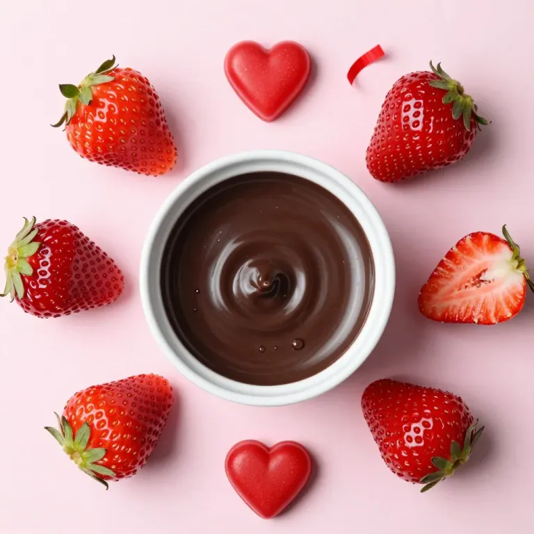 A white ceramic bowl filled with smooth, glossy dark chocolate dip is surrounded by fresh strawberries and red heart-shaped candies, arranged in a circular pattern on a soft pink surface. Soft overhead lighting creates gentle highlights on the chocolate and strawberries, while a shallow depth of field emphasizes the central bowl against a clean, uniform background.