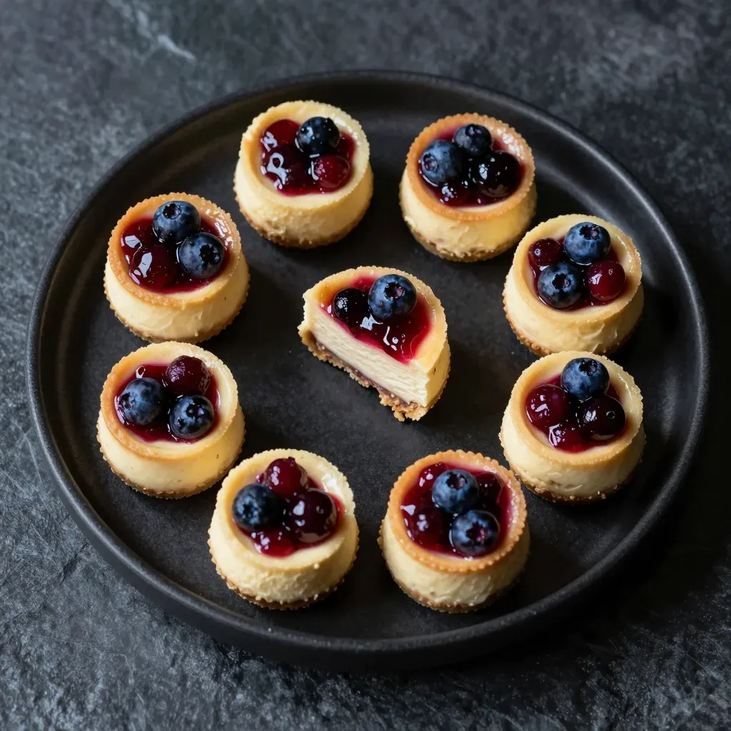 #Mini Cheesecakes#Blueberries#Glossy Sauce#Crisp Crust#Creamy Filling#Dark Background#Soft Lighting#Food Photography#Dessert Display