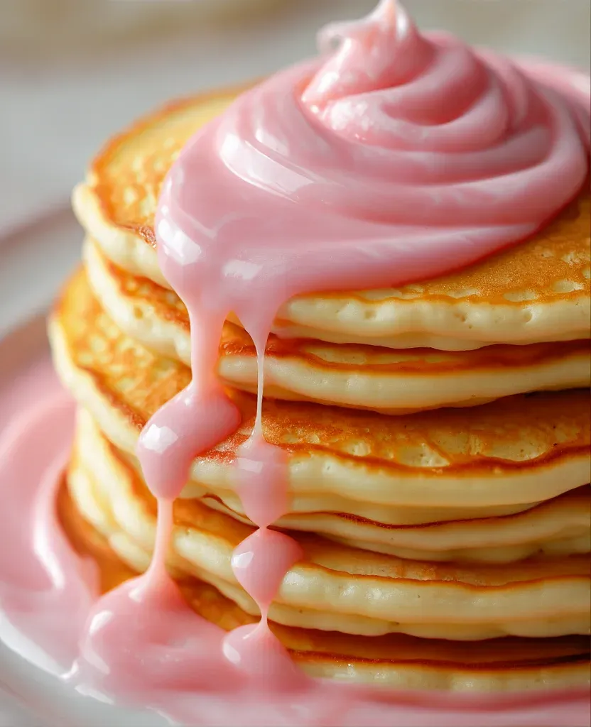 A stack of golden pancakes topped with glossy pink cream, swirled on top and dripping down the sides, creating a warm and inviting atmosphere. The soft, diffused lighting highlights the textures and colors, emphasizing the creamy and fluffy nature of the pancakes and cream.