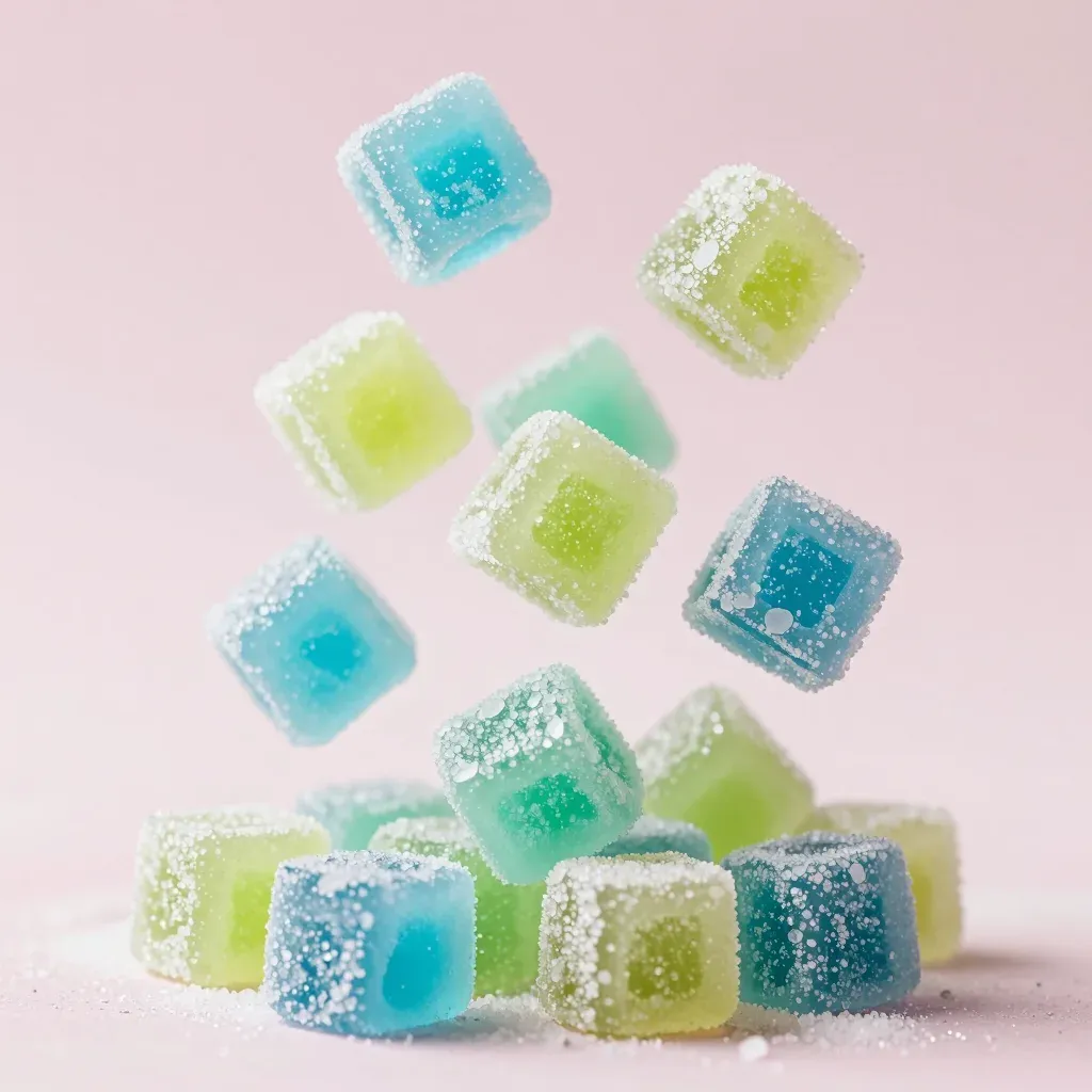 Glossy, sugary-coated cool mint candies descend gracefully against a soft pink background, illuminated by diffused light that highlights their translucence and sugar crystals. The dynamic composition and clean backdrop provide ample copy space for various design applications.