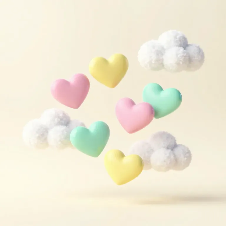 Pastel-colored hearts with a glossy, candy-like texture float gently in a soft, diffused light, creating a dreamy and whimsical scene. The slightly blurred background emphasizes the hearts and provides ample copy space for design purposes.