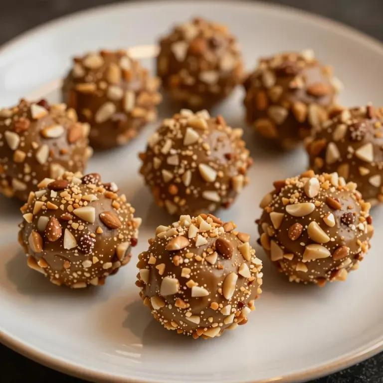 Spherical almond butter bites with a crumbly, granular exterior coated in chopped almonds and sesame seeds, showcasing a glossy sheen under warm directional lighting. The shallow depth of field emphasizes the central bites against a clean, out-of-focus dark background, enhancing their three-dimensional form and textural detail.