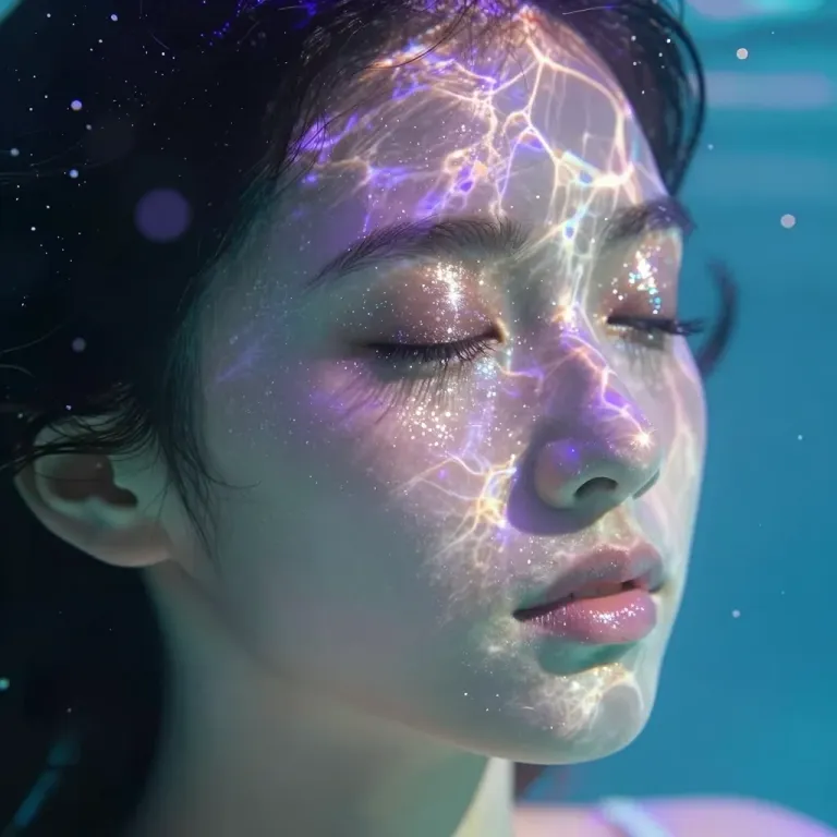A person's face, eyes closed, adorned with a glossy, glittery makeup projection of starlight and electric currents, bathed in soft, diffused lighting that highlights the subject against a dark, starry background, creating a serene and ethereal atmosphere.
