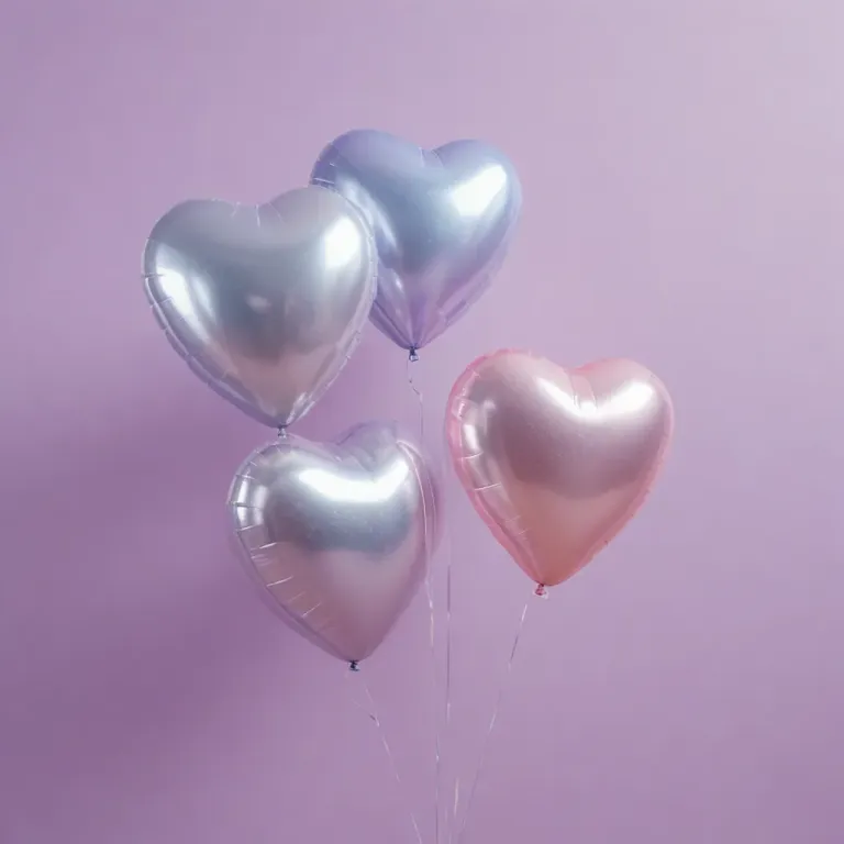 Four heart-shaped balloons in silver, lavender, and pink, with a holographic, glossy finish, gently floating against a soft lavender background. The diffused lighting highlights the reflective surfaces, creating a dreamy, ethereal atmosphere.