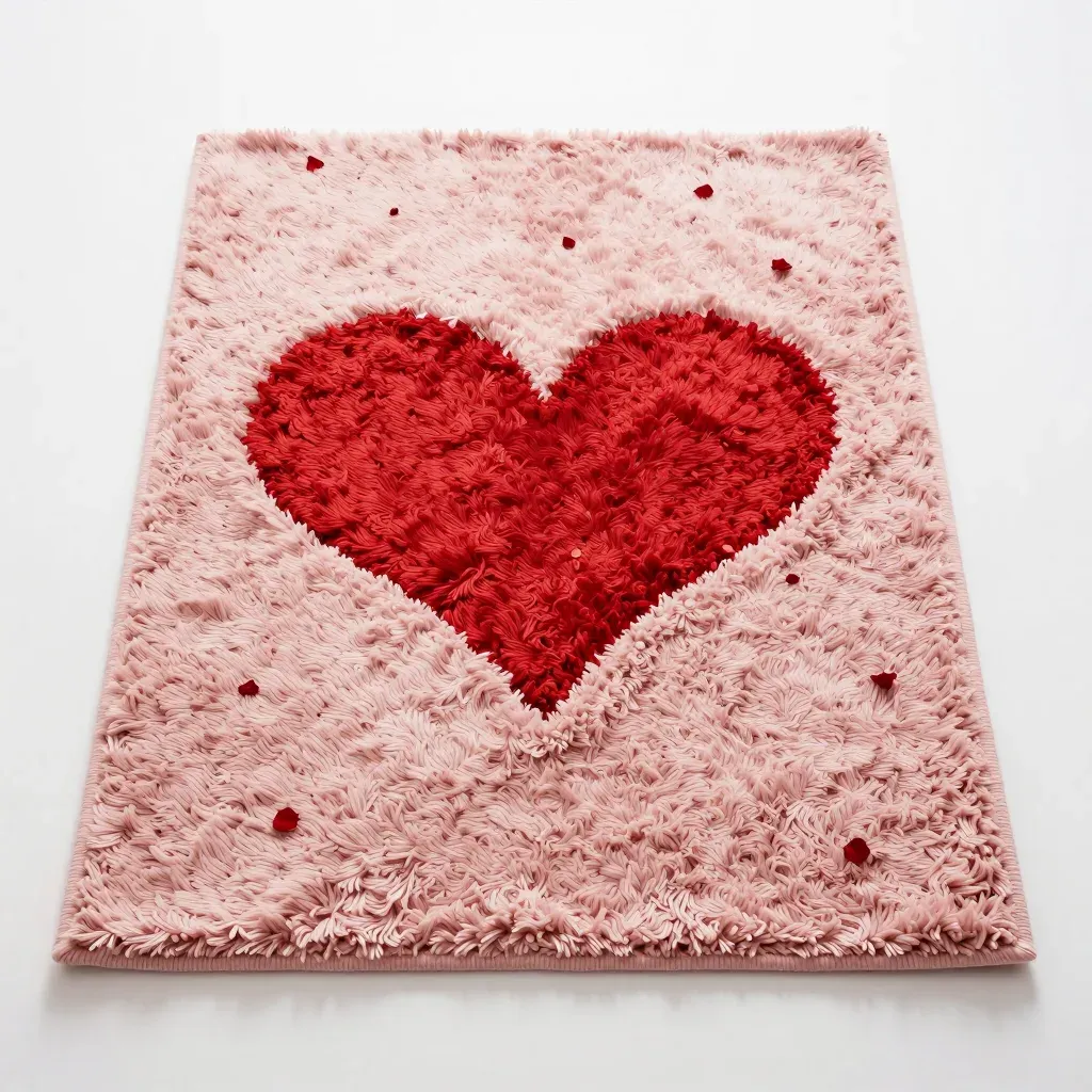A soft, shaggy, plush heart-shaped accent throw rug with a deep red heart design, softly lit from above to create a warm and inviting glow. The plain white background emphasizes the rug as the focal point, offering ample copy space for design integration.