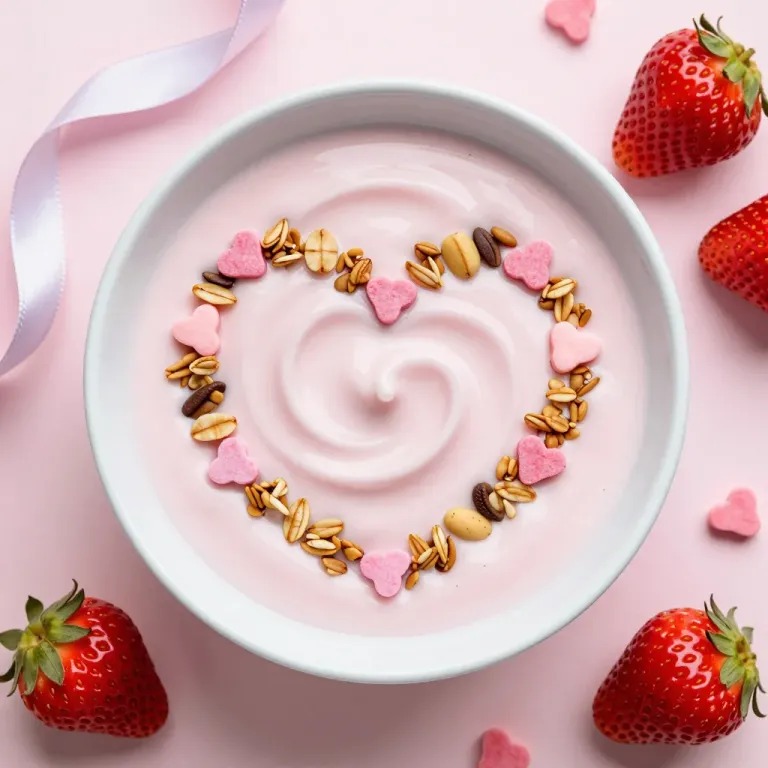A creamy yogurt swirl is artfully adorned with heart-shaped cookies, creating a visually appealing heart shape. The soft, diffused lighting highlights the glossy texture of the yogurt and the crunchy cookies, set against a blurred background of strawberries and a ribbon, drawing attention to the bowl.
