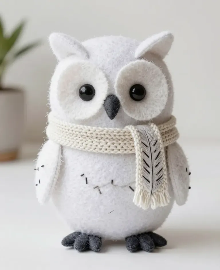 A close-up of a white owl plush toy adorned with a knitted scarf featuring a feather detail, illuminated by diffused, soft light that highlights the plush texture and creates gentle shadows. The simple white background with a blurred green plant ensures the subject is the focal point, offering ample copy space for design integration.