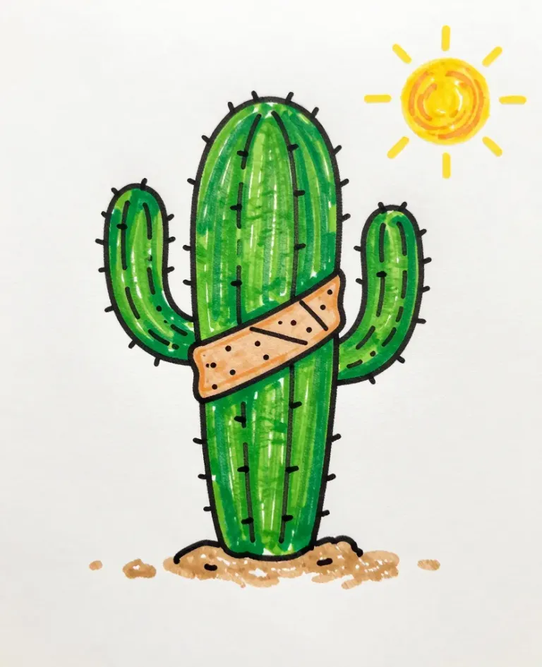 A glossy green cactus with a bandage on its trunk stands in a sparse desert landscape under bright, direct sunlight. The composition is centered, with the sun in the upper right corner, creating sharp shadows and highlights, emphasizing the cactus as the focal point.