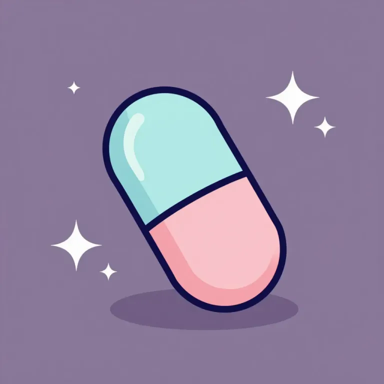 A glossy, two-toned capsule (blue and pink) gleams under soft, diffused light, creating highlights and reflections. The image is centered with a shallow depth of field, set against a solid lavender background with white sparkles, providing a calm and neutral backdrop.