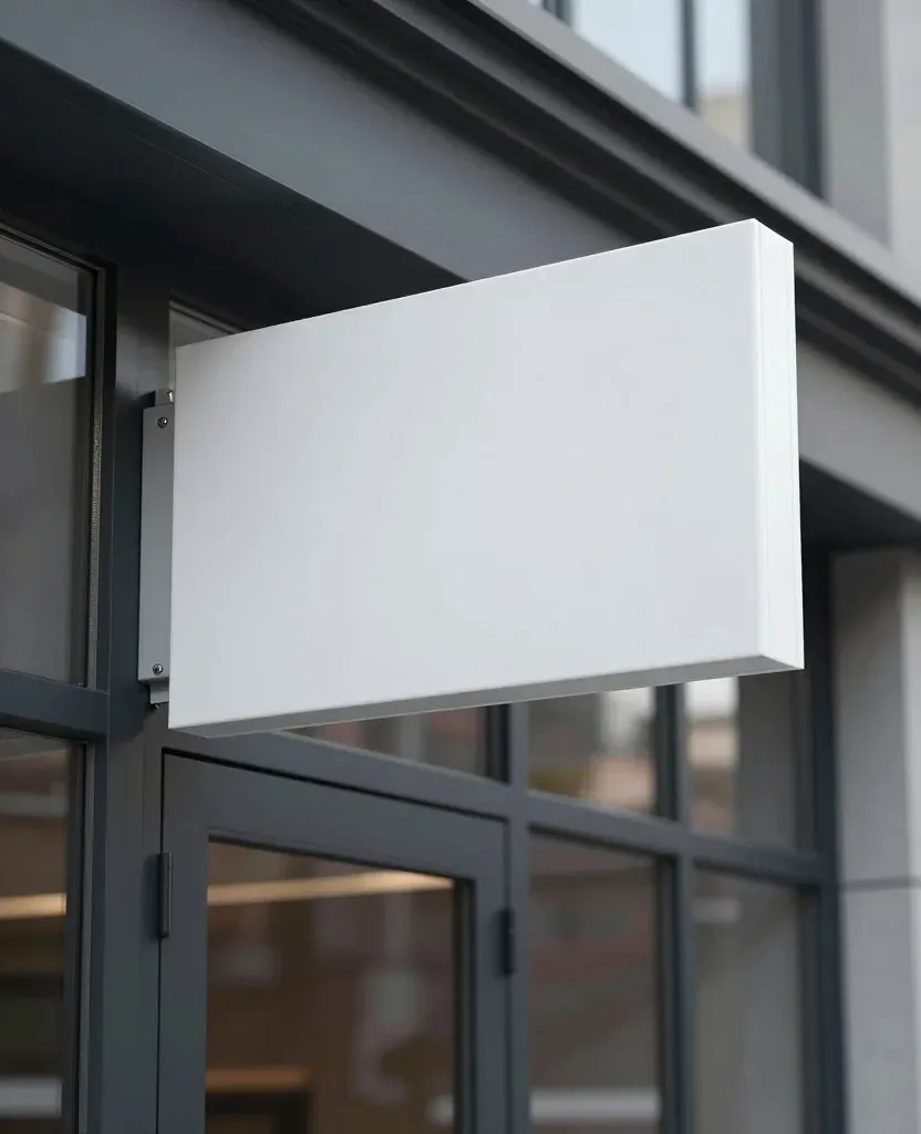 A smooth, glossy white signboard hangs from a modern building with a metal framework, illuminated by soft, diffused, warm interior light. The shallow depth of field and centered composition create a clean, minimalist aesthetic.
