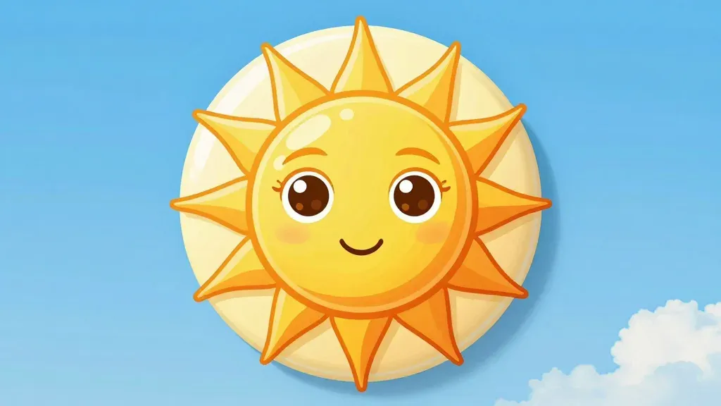 A cheerful anthropomorphic sun with expressive eyes and a smiling face, set against a bright, clear blue sky with soft white clouds, creating a vibrant and uplifting scene. The direct sunlight highlights the glossy golden surface, enhancing the three-dimensional appearance and providing ample copy space for design elements.