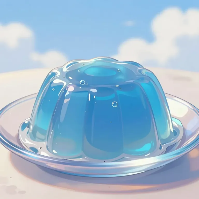 A glossy blue jelly dessert sits on a clear glass plate, illuminated by soft, diffused light that creates gentle highlights and reflections on its surface. The blurred background of a pastel sky with fluffy clouds enhances the dreamy, airy atmosphere.