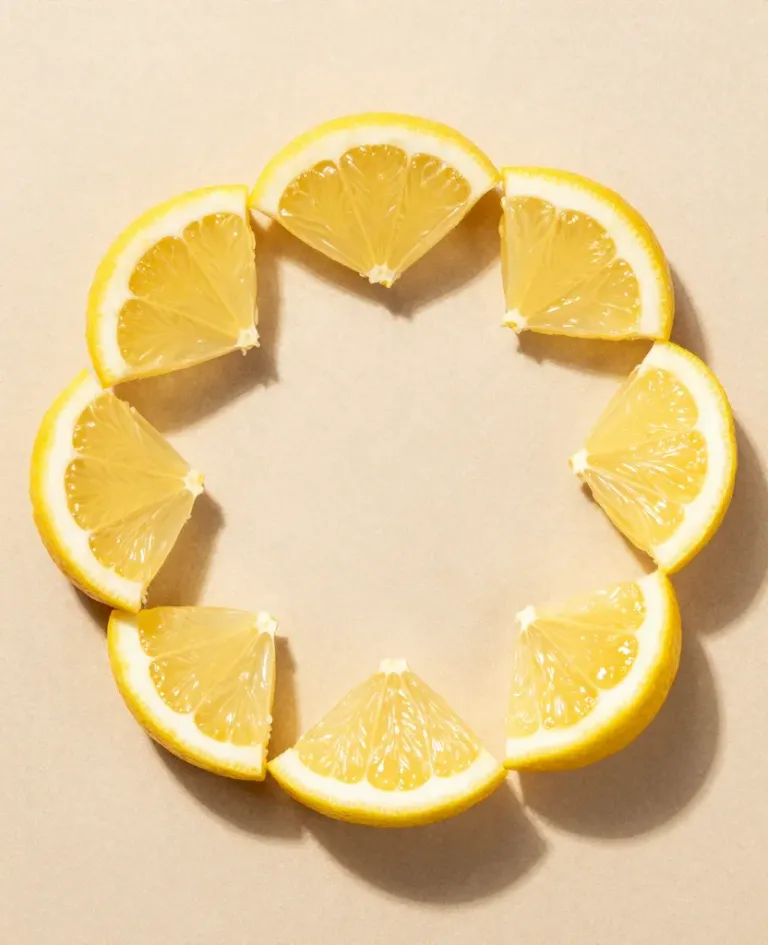 Soft, juicy lemon wedges arranged in a circular pattern, illuminated by diffused light creating gentle shadows and highlights. The neutral beige background slightly blurs the edges, emphasizing the vibrant yellow and white hues of the lemons.