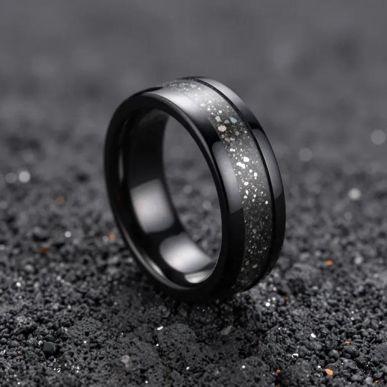 A sleek black ceramic ring features embedded meteorite fragments creating a gritty, crystalline texture within a central groove, set against a dark, granular background. Soft directional lighting from the upper left produces sharp metallic highlights and a shallow depth of field isolates the ring, emphasizing its three-dimensional form.