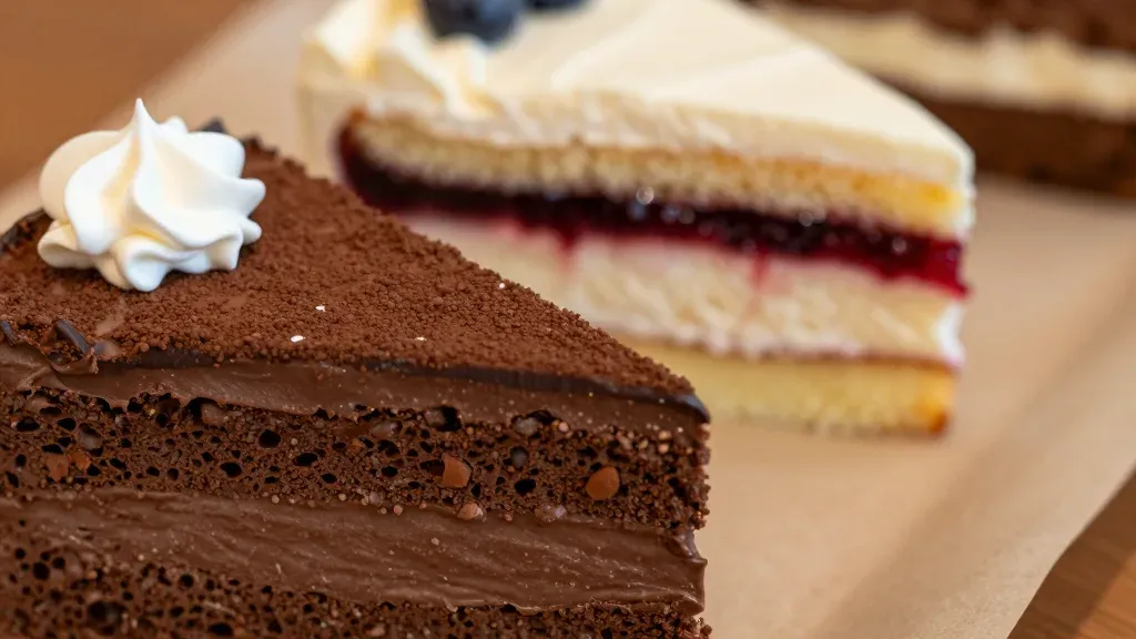 A close-up of a slice of chocolate cake with a glossy cocoa-dusted finish, showcasing its layers and textures under soft, diffused lighting. The blurred wooden background ensures the focus remains on the cake's rich, detailed appearance.