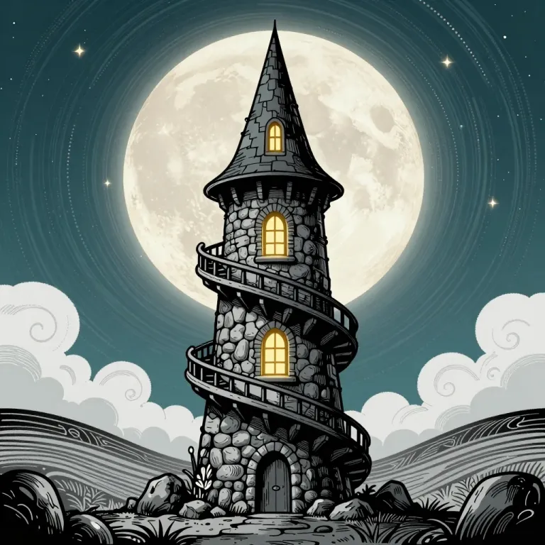 A spiral stone tower with multiple balconies and a pointed roof is illuminated by the ethereal glow of a full moon, casting long shadows and highlighting the textured stone. Swirling clouds below add a dynamic element to the composition, creating a sense of depth and scale.