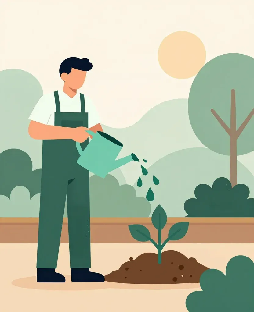 A gardener bends to water a small plant with a turquoise watering can, set against a soft, diffused light from the setting sun, casting gentle shadows and highlighting the textures of the soil and plant. The tranquil, pastoral background with hills, a tree, and a setting sun provides a calm and natural setting.