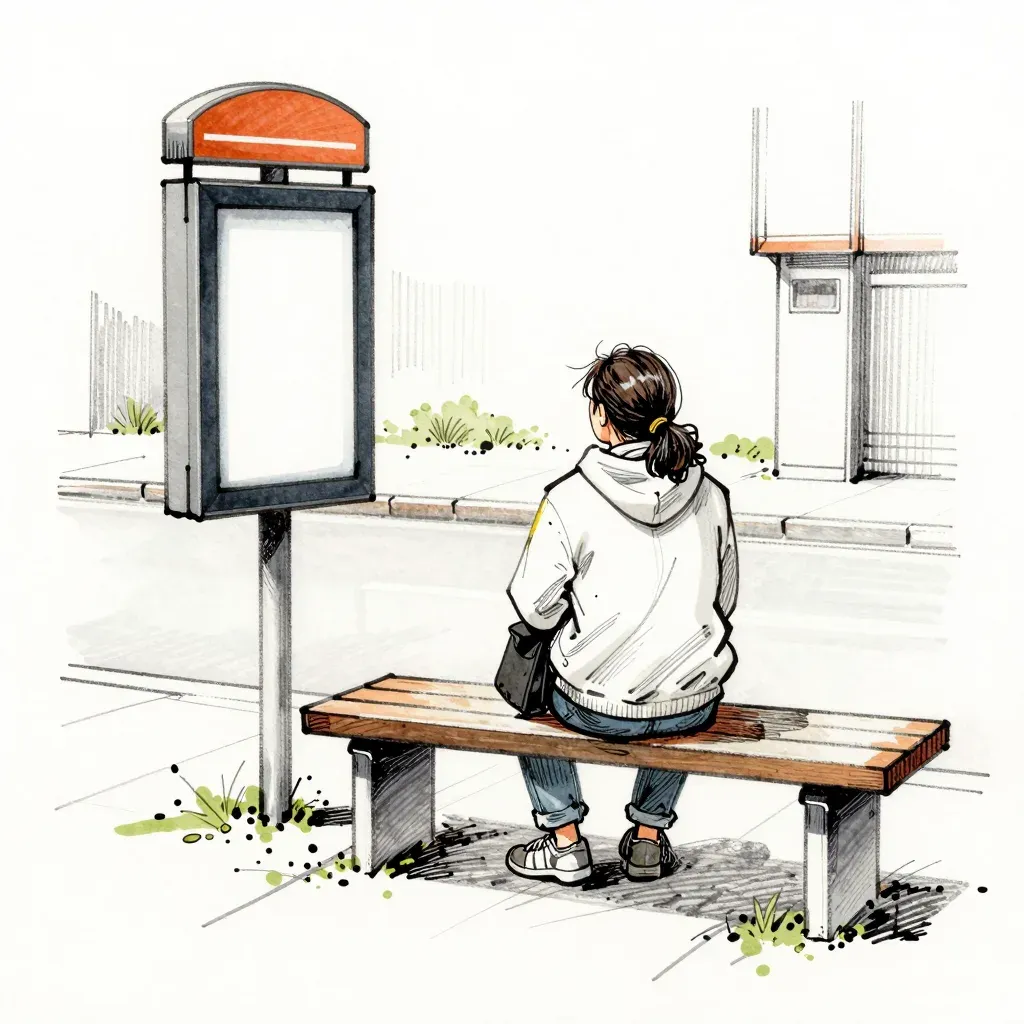 A young person sits on a rough wooden bench at a bus stop, wearing a white hoodie, with a glossy bus stop sign casting soft directional light. The urban setting, slightly blurred, emphasizes the subject and creates a calm, contemplative mood.