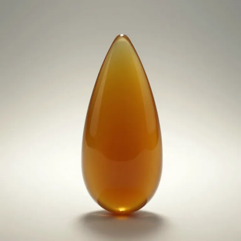 A vertically oriented amber glass teardrop exhibits a smooth, glossy surface with internal luminosity and high sheen under soft front-top lighting. The minimalist composition with a seamless white background and shallow depth of field emphasizes the object's form and translucency.