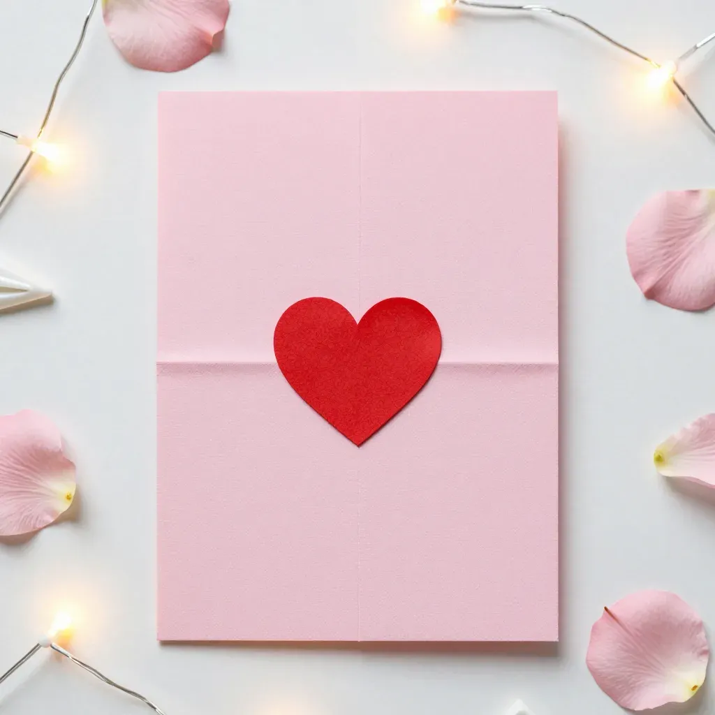 A pink card featuring a glossy red heart is arranged in a flat lay, surrounded by soft rose petals and warm fairy lights, creating a romantic and inviting atmosphere. The diffused, warm lighting enhances the delicate textures and colors, making it ideal for Valentine's Day or romantic designs.