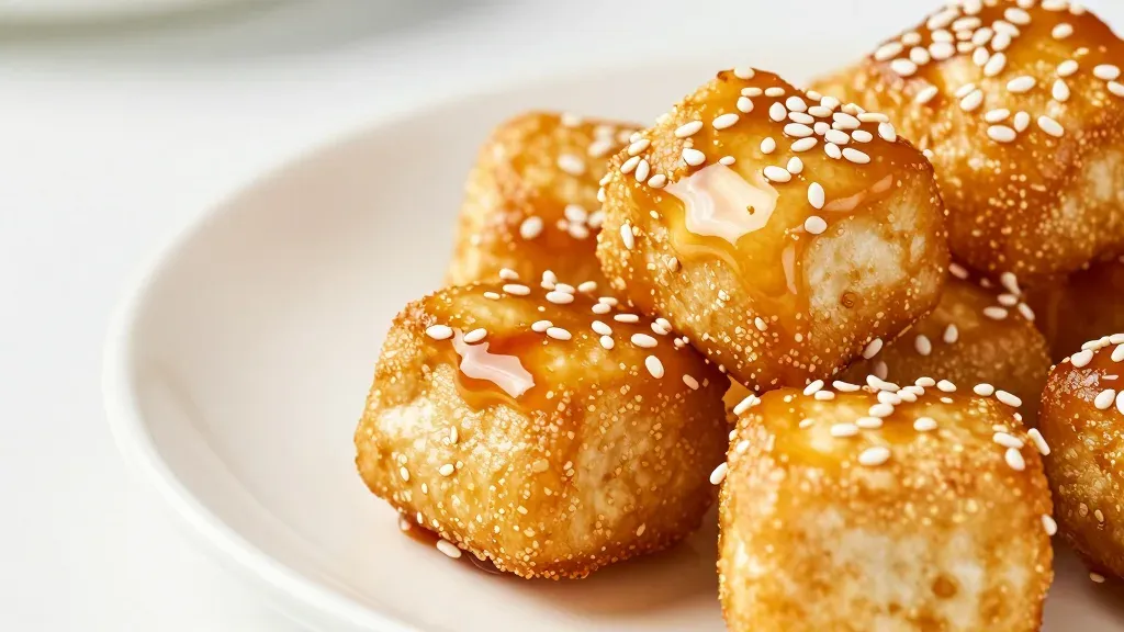 Crisp golden-brown fried dough cubes, coated in a sticky amber glaze and sprinkled with creamy white sesame seeds, showcase a rich textural contrast. Soft diffused lighting highlights the glossy sheen and shallow depth of field isolates the subject against a clean, neutral background.