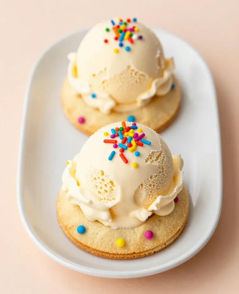 Two golden cookies topped with scoops of vanilla ice cream and colorful sprinkles, presented on a white plate with warm, soft lighting that enhances the three-dimensional appearance of the dessert. The neutral background keeps the focus on the subject, creating a clean and inviting composition.