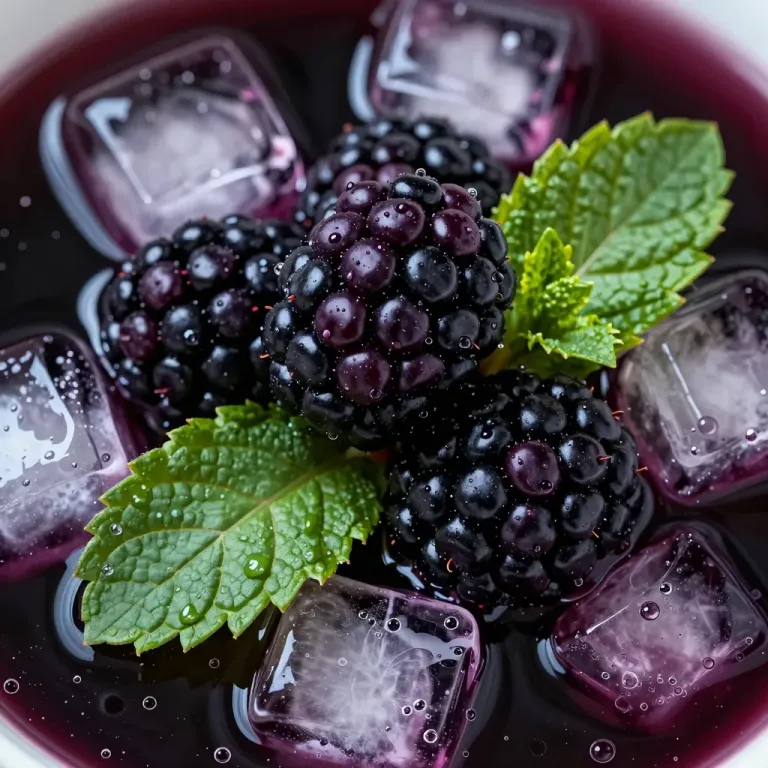 A close-up of a blackberry-mint cocktail featuring glossy blackberries, crystalline ice cubes, and velvety mint leaves floating in a viscous, deep plum liquid. Soft diffused overhead lighting creates gentle highlights and subtle rim light, while a shallow depth of field blurs the dark liquid background, emphasizing the central cluster.